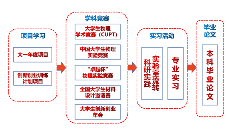 创新实践体系包括:大一年度项目、创新创业训练计划项目、中国大学生物理学术竞赛(CUPT)等学科竞赛活动、阶段性的实验室流转科研实践、专业实习和本科毕业论文等。