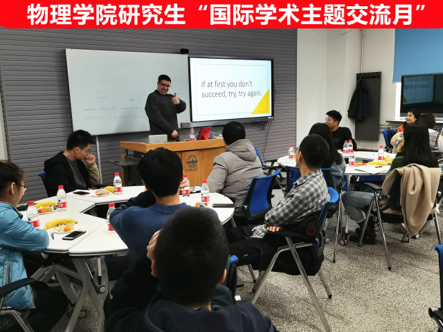 10月30日下午,物理学院在正心楼303举行研究生“国际学术主题交流月”第三期--“口语&听力”英文讲座活动。物理学院辅导员秦必达老师,外教Daniel Kevin Penistone受邀参加本次活动,本次讲座由兼职辅导员博士生周大围主持,物理学院硕士和博士研究生参加。