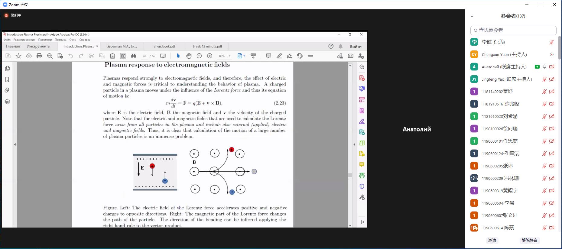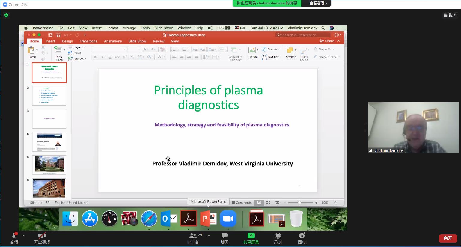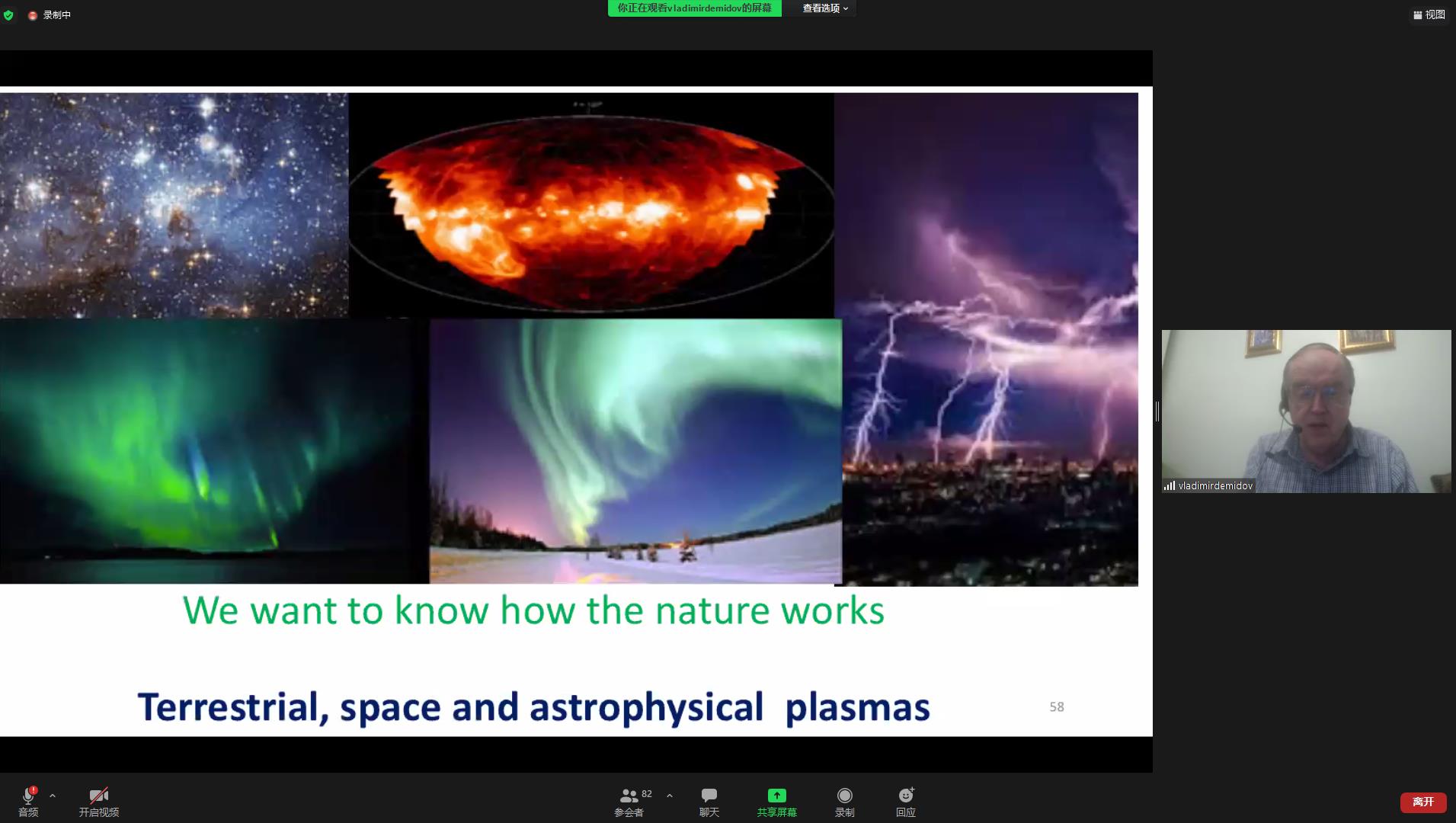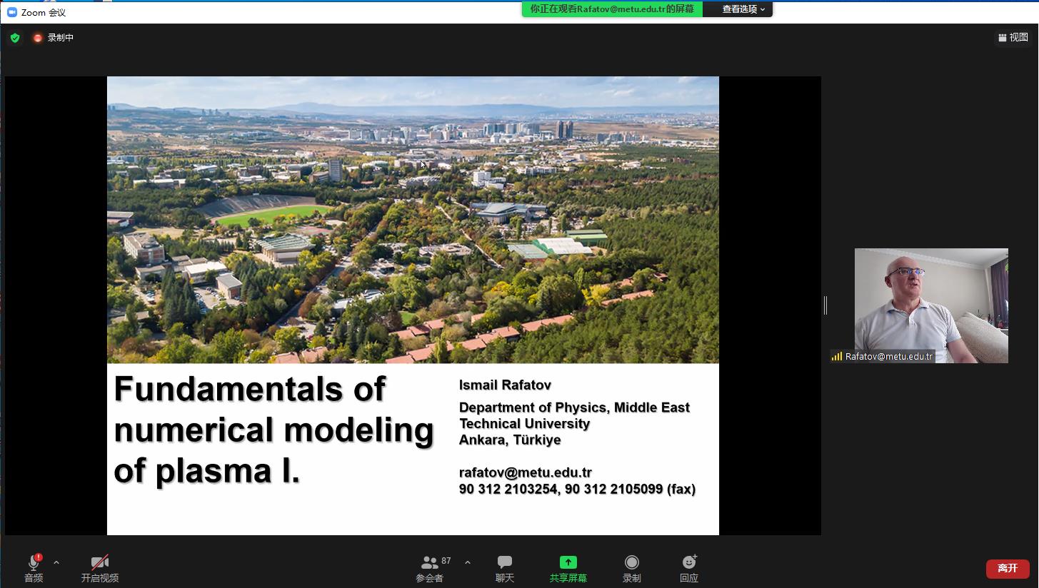 本次暑期学校时间为2021年7月17日至7月22日,每日分上、下午两个时段为学生安排教学内容,邀请了等离子体领域的中俄专家通过课程和讲座两种方式来介绍等离子体物理基础知识与技术应用、前沿进展、研究热点和未来发展方向。其中三门核心课程:等离子体物理简介(8学时)、等离子体诊断原理(8学时)、等离子体数值模拟基础(8学时),分别由国际知名等离子体放电专家、圣彼得堡国立大学A. Kudryavtsev教授,等离子体诊断技术专家、美国西弗吉尼亚大学V. Demidov教授讲授,等离子体数值模拟专家、中东科技大学I. Rafatov教授。同时本次暑期学校共安排了8次等离子体物理前沿进展讲座(共16学时),分别由国内外等离子体物理领域知名研究专家与学者进行讲授,包括国内等离子体领域权威、我校大学科装置首席科学家王晓钢教授,清华大学工程物理系李和平研究员,中国电子科技集团国家级重点实验室创新团队学术带头人徐彬研究员,国际著名低温等离子体物理专家、俄罗斯自然科学院院士、莫斯科国立大学V. L. Bychkov教授,哈尔滨工业大学国家级青年人才聂秋月教授,国家引进人才计划青年项目获得者朱悉铭教授等。各位专家在等离子体物理授课方面经验丰富,结合科研热点深入浅出,让每名学生都有收获有进步。中英文结合的授课方式让学生易接受好理解,云端交流拉近了学生与专家、学生与学生之间的距离,获得学生一致的肯定与好评。