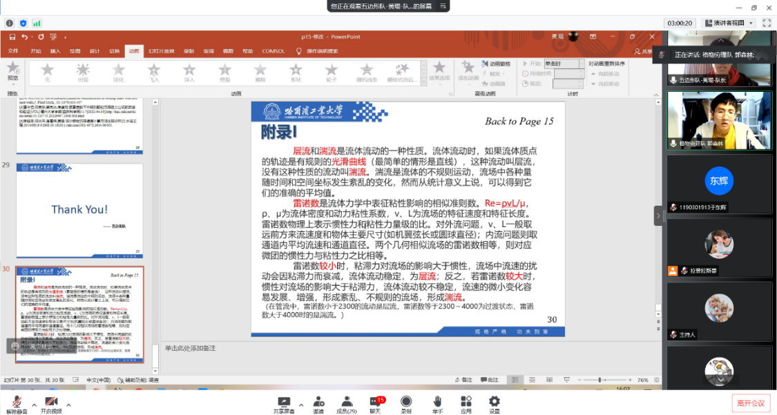 本次校内赛于5月1日上午8点在腾讯会议举行线上开幕式。物理学院执行院长田浩副院长张宇、党委副书记赵异肖参加开幕式并分别讲话,介绍了举办比赛的初衷,表达了对参赛队伍的鼓励,并深切期望参赛的同学能够在备赛和比赛的过程中有所收获。各支队伍依次进行队伍介绍和风采展示,各支队伍都通过口号表达出了自己的精神面貌。开幕式2019级国赛队员黄昕诺主持