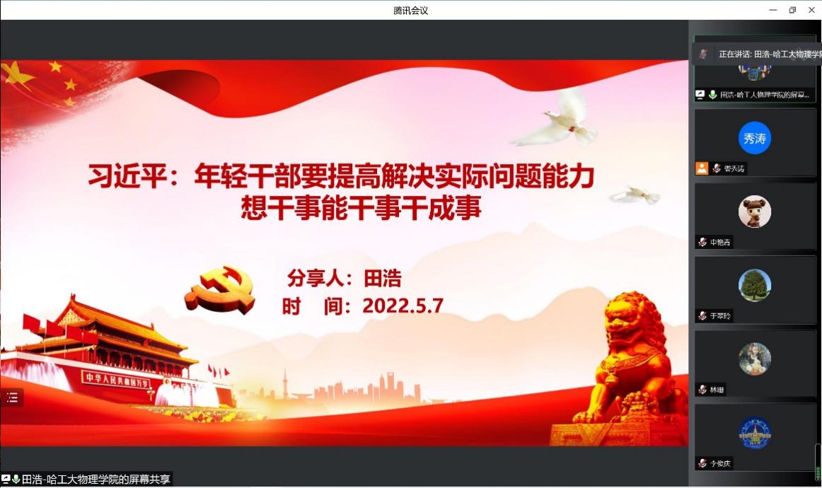 2022年5月7日上午,物理学院执行院长田浩为实验物理教工党支部讲授党课,支部全体党员和物理实验中心部分骨干教师参与学习。田浩围绕习近平总书记在中央党校(国家行政学院)中青年干部培训班开班式上的重要讲话,结合自身的学习工作经历和物理学院发展实际,针对“年轻干部要提高解决实际问题能力,想干事能干事干成事”这一主题进行了深刻的阐述和分享。