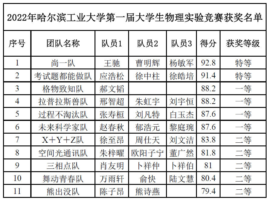 哈尔滨工业大学第一届大学生物理实验竞赛(创新赛)成绩表