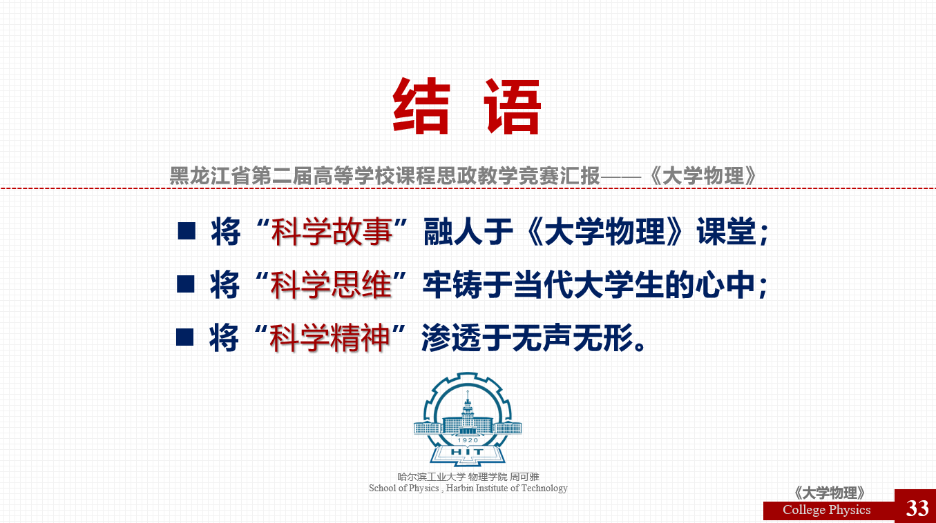 据悉,物理学院高度重视课程思政建设工作,成立了课程思政教学研究分中心,积极推动课程思政建设,在过去两届黑龙江省高校课程思政教学竞赛中均斩获特等奖。今后,学院将继续深入学习领会教育部课程思政建设要求,从课程思政内涵建设、教学名师与团队培育等方面进一步推动课程思政工作提质增效,发挥优秀建设课程的教学示范与传帮带作用,把价值观培育和塑造“基因式”地融入所有课程,把思想政治工作贯穿教育教学全过程,让立德树人“润物无声”。