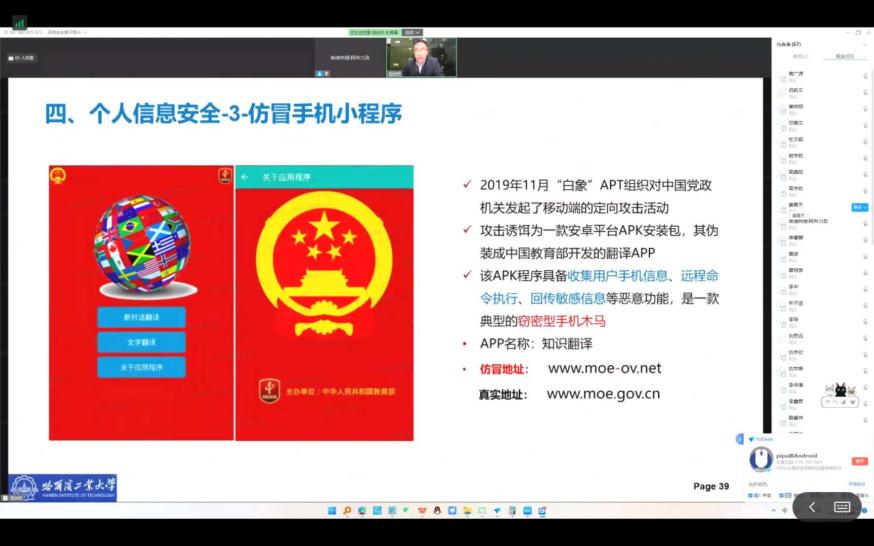为深入学习贯彻习近平总书记关于建设网络强国的重要思想,提升同学们的网络安全意识和网络安全防护能力,引导同学们树立正确的网络安全观,11月6日晚,物理学院联合电信学院组织学生开展网络安全意识线上培训,培训由物理学院兼职辅导员、学校网信办综合办公室负责人祖宏权老师主讲。