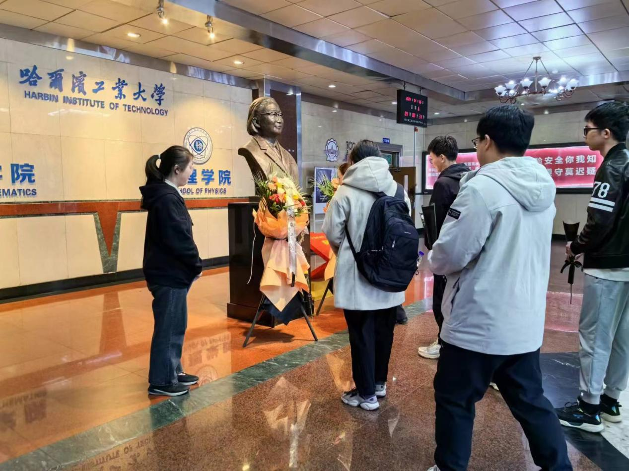 上午9时,党员同学们于理学楼洪晶先生雕像前开展祭扫活动。主持人吴瑶带领大家重温了学术大师的奋斗故事和许党报国之志,引导广大学生党员在哈工大“八百壮士”精神引领下砥砺奋进。接着,全体同学共同默哀,在肃穆的氛围中表达对洪晶先生的敬仰与哀思