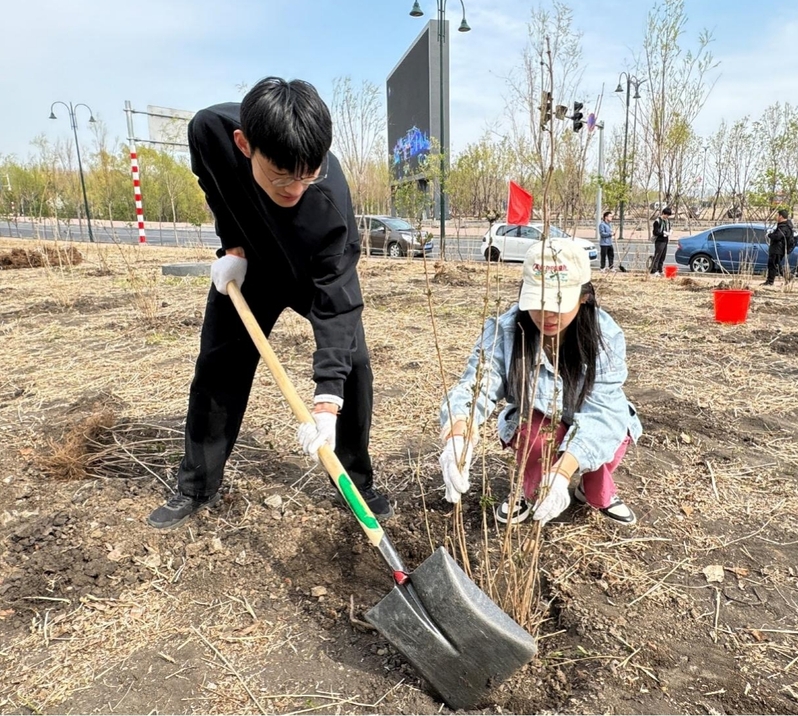 4月28日下午,志愿者们乘坐大巴车前往松北区冰峰路,开展集体植树活动。志愿者们在环卫工人的指导下分工协作,挥锹铲土、扶苗填坑、踩实修整,配合默契,植树活动忙碌而有序,新栽植的棵棵树苗迎风挺立,展现勃勃生机。