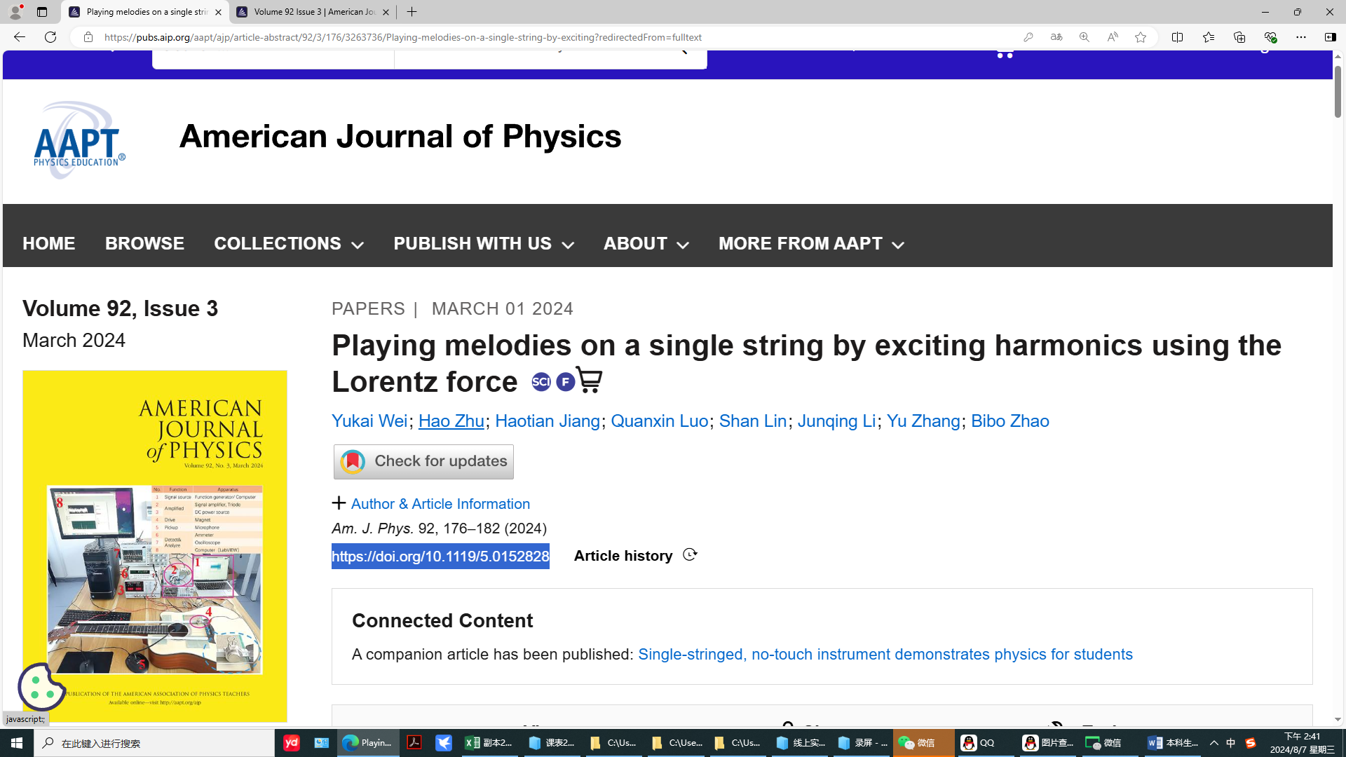 论文创新地展示了如何利用安培力激发弦的受迫振动,仅用一根琴弦就能发出有音阶关系的乐音。通过巧妙利用乐音谐波泛音成分间的整数比关系,成功实现了在单弦上非接触式地演奏和弦旋律。论文于20243月正式发表在《American Journal of Physics》(AJP),并被选为封面论文。AJP是全球顶级教学研究类期刊,由美国物理教师协会(AAPT)主办,具有非常广泛的影响力。该期刊主编Beth Parks教授在封面附言中高度评价了这一创新:一个独弦吉他可以弹奏音阶,通过在弦上施加振荡电流,附近的永磁体产生振荡力,选择正确的谐波使旋律演奏成为可能。此外,该论文还被AIP出版集团的Scilight杂志推介,强调了其创新性和教育意义。