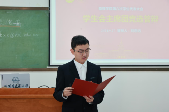近日,物理学院在理学楼202室召开了第六次学生代表大会。物理学院党委副书记陶海亮,团委书记张丽玫,学生党建负责人、团委副书记库迪热提·阿布力孜,团委副书记张斌,校学生会主席团成员李品谋出席会议,物理学院第五届学生会主席团成员及学生代表参与会议。会议由第五届学生会学习部副部长吴瑶主持。